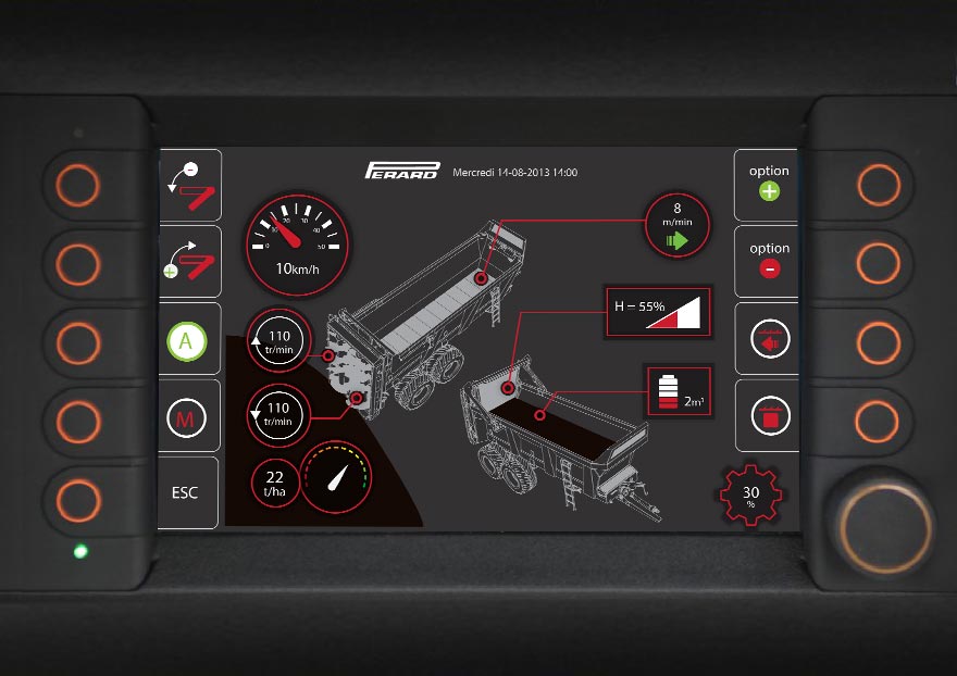 Evok a conceptualisé une IHM dédiée aux épandeurs. Son ergonomie repose sur la gestion de débit et de la quantité du produit à épandre. Elle permet d'améliorer la productivité de l'équipement en optimisant la quantité de matière organique dispersée.